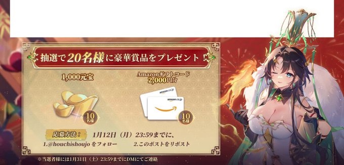 賞品:1000元宝、Amazonギフト券2,000円分(20名様)