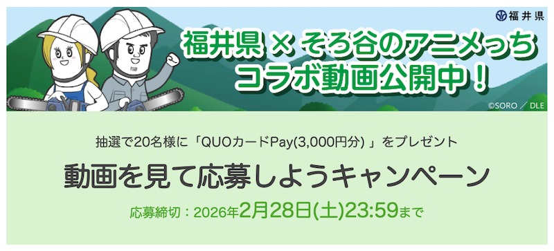 QUOカードPay3,000円分を20名様にプレゼント 2026.01.09福井県×そろ谷のアニメっち コラボ動画公開中 賞品:QUOカードPay3,000円分(20名様) 締切:2026年2月28日(土)アンケートに答えてご応募ください。※詳細はキャンペーンページにてご確認ください。応募はこちらから