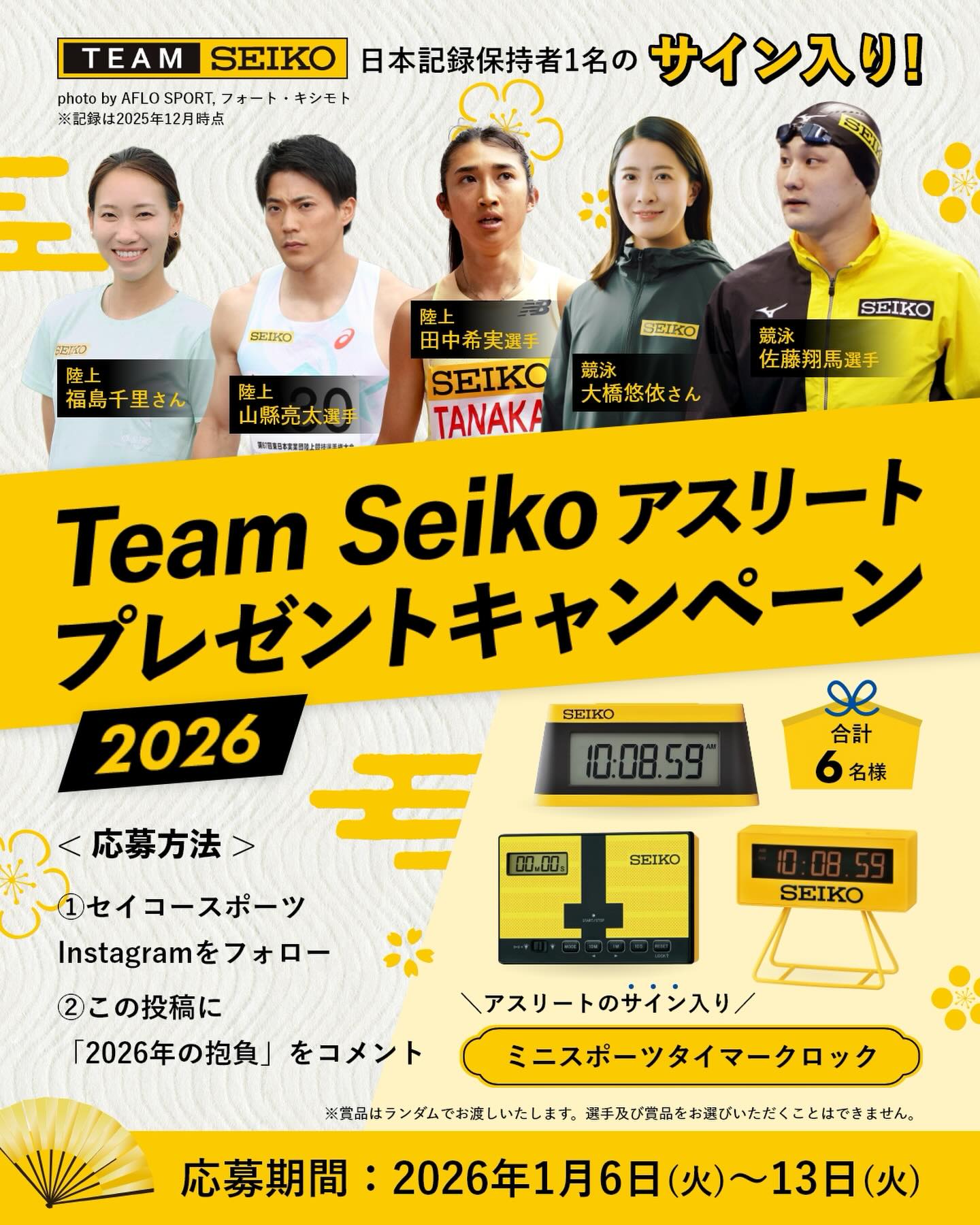 賞品:#TeamSeiko アスリートのサイン入りクロック(6名様)