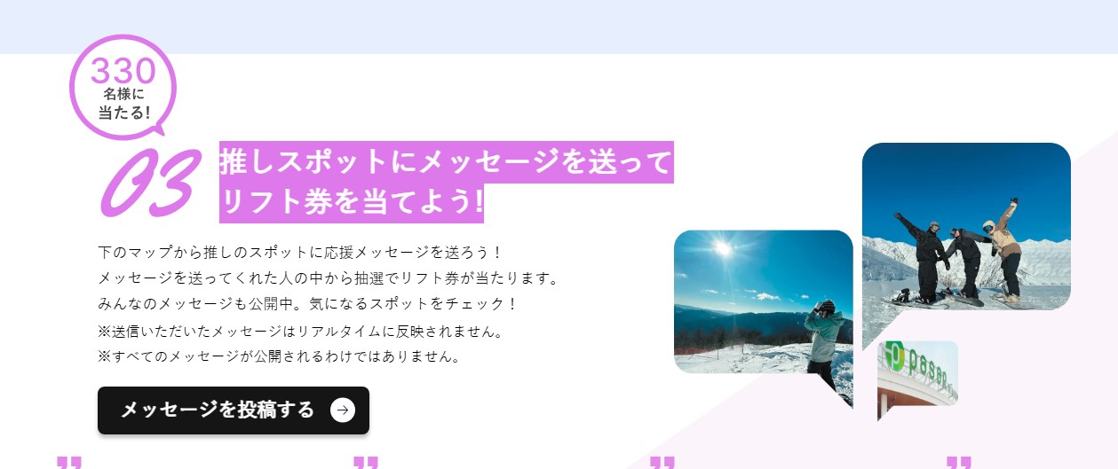 リフト券を330名様にプレゼント 2026.01.11待ってろゲレンデ当てるぜリフト券キャンペーン 推しスポットにメッセージを送ってリフト券を当てよう! 賞品:リフト券(330名様) 締切:2026年2月15日(日)メッセージを送ってくれた人の中から抽選でリフト券が当たります。※詳細はキャンペーンページにてご確認ください。応募はこちらから