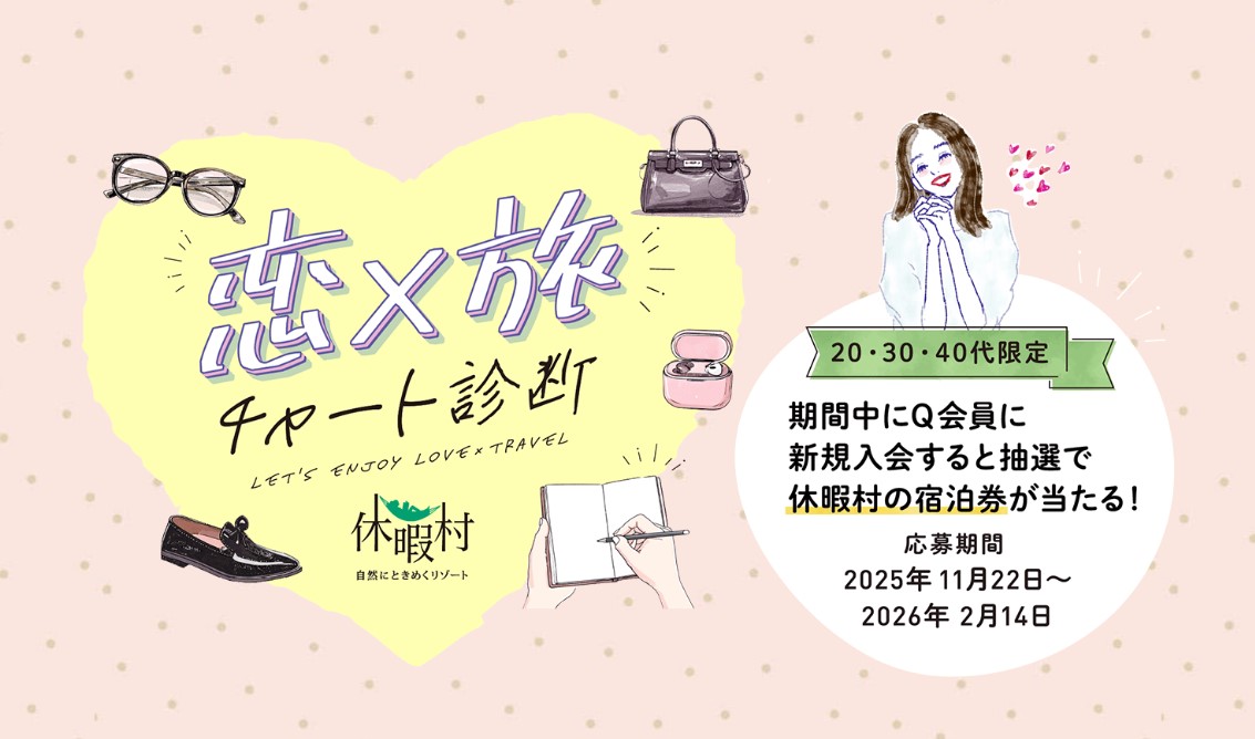 休暇村の宿泊券を34組68名様にプレゼント 2026.01.11休暇村公式ホームページ‐「恋×旅」チャート診断 賞品:休暇村の宿泊券(34組68名様) 締切:2026年2月14日(土) 20・30・40代限定 期間中にQ会員に新規入会すると抽選で休暇村の宿泊券が当たる!※詳細はキャンペーンページにてご確認ください。応募はこちらから