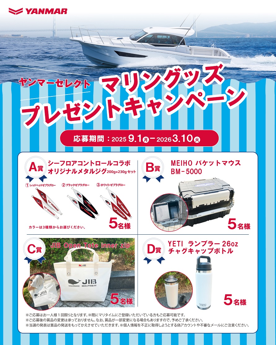 釣りに大活躍するフィッシンググッズを合計20名様にプレゼント 2026.01.11ヤンマー フィッシングギアプレゼントキャンペーン 賞品:釣りに大活躍するフィッシンググッズ(合計20名様) 締切:2026年3月10日(火)応募フォームより必要事項を入力してご応募ください。※詳細はキャンペーンページにてご確認ください。応募はこちらから
