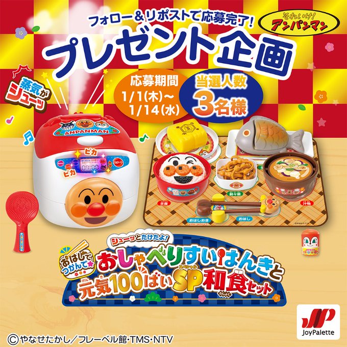 賞品:アンパンマン「おはしでつかんで★シューッとたけたよ!おしゃべりすいはんきと元気100ばいSP和食セット」(3名様)