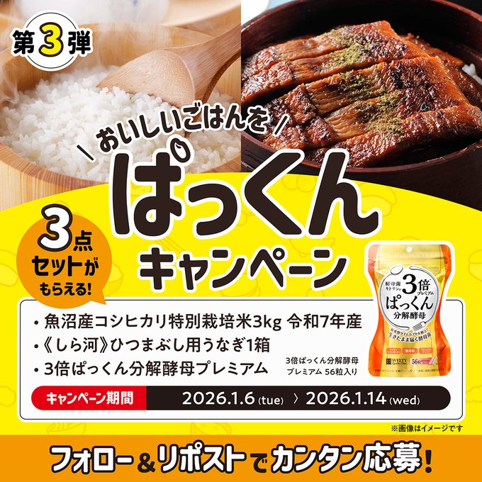 賞品:魚沼産コシヒカリ&しら河 ひつまぶし用うなぎ1箱&3倍ぱっくん分解酵母プレミアム(5名様)