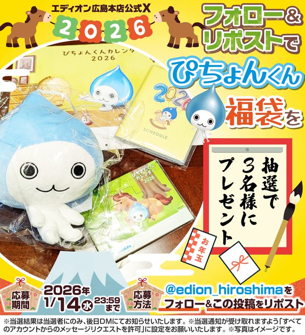 【X懸賞】ぴちょんくんグッズ福袋を3名様にプレゼント 2026.01.12エディオン広島本店‐お年玉プレゼント企画 賞品:ぴちょんくんグッズ福袋(3名様) 締切:2026年1月14日(水)公式X(Twitter)アカウントをフォロー&キャンペーン対象ポストをリポストしてご応募ください。※詳細はキャンペーンページにてご確認ください。応募はこちらから