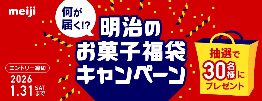 明治の商品詰め合わせを30名様にプレゼント 2026.01.12明治のお菓子福袋キャンペーン 賞品:明治の商品詰め合わせ(30名様) 締切:2026年1月31日(土)ご応募には会員登録/ログインが必要です。※詳細はキャンペーンページにてご確認ください。応募はこちらから