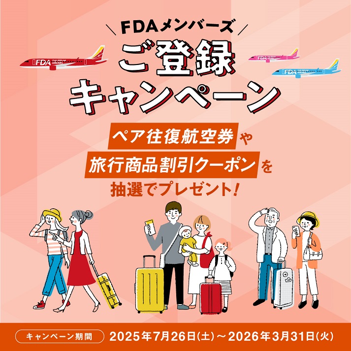 FDAペア往復航空券や15,000円の旅行商品割引クーポンが抽選で当たる!