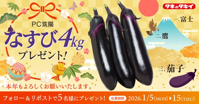 【X・Instagram懸賞】ナス『PC筑陽』4kgを5名様にプレゼント 2026.01.13タキイ種苗株式会社(タネのタキイ)‐プレゼントキャンペーン 賞品:ナス『PC筑陽』4kg(5名様) 締切:2026年1月15日(木)公式X(Twitter)アカウントをフォロー&キャンペーン対象ポストをリポストしてご応募ください。Instagramからも応募できます。※詳細はキャンペーンページにてご確認ください。応募はこちらから