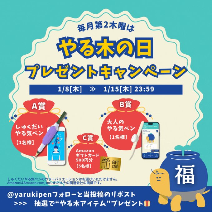 賞品:しゅくだいやる気ペン、大人のやる気ペン、Amazonギフトカード500円分(7名様)