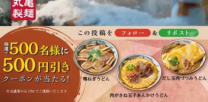 丸亀製麺公式X(Twitter)アカウントをフォロー&キャンペーン対象ポストをリポストしてご応募ください。