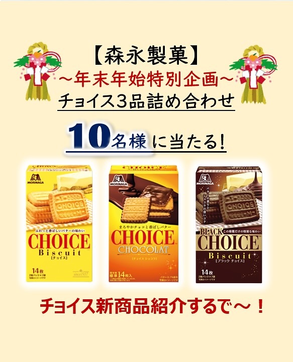【Instagram懸賞】チョイス3品詰め合わせを10名様にプレゼント 2026.01.14森永製菓 関西‐フォロー&いいねキャンペーン 賞品:チョイス3品詰め合わせ(10名様) 締切:2026年1月16日(金)応募方法: 1. 公式Instagramアカウントをフォロー 2. 対象の投稿に「いいね!」※詳細はキャンペーンページにてご確認ください。応募はこちらから