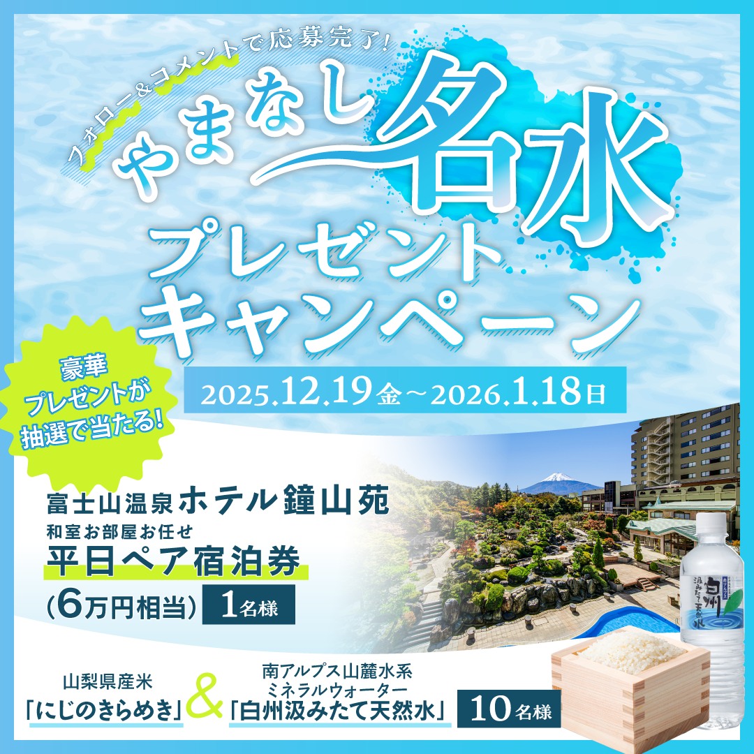 【Instagram懸賞】富士山温泉ホテル鐘山苑 和室・平日ペア宿泊券、にじのきらめき&白州汲みたて天然水を合計11名様にプレゼント