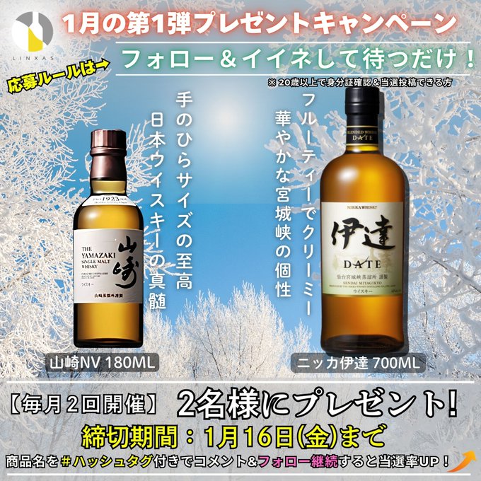 賞品:山崎NV 180ml、ニッカ伊達 700ml(2名様)
