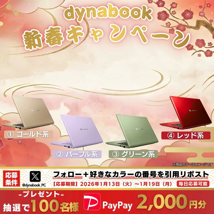 【毎日・X懸賞】PayPay2,000円分を100名様にプレゼント 2026.01.14dynabook‐新春キャンペーン 賞品:PayPay2,000円分(100名様) 締切:2026年1月19日(月)応募方法✔️ @dynabook_PC をフォロー✔️ 好きなカラーの番号を引用リポスト※詳細はキャンペーンページにてご確認ください。応募はこちらから