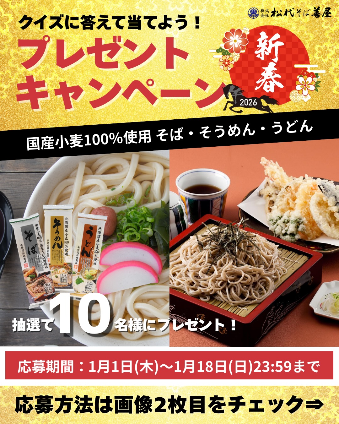 賞品:国産小麦を100%使用したそば・そうめん・うどん3袋セット(10名様)
