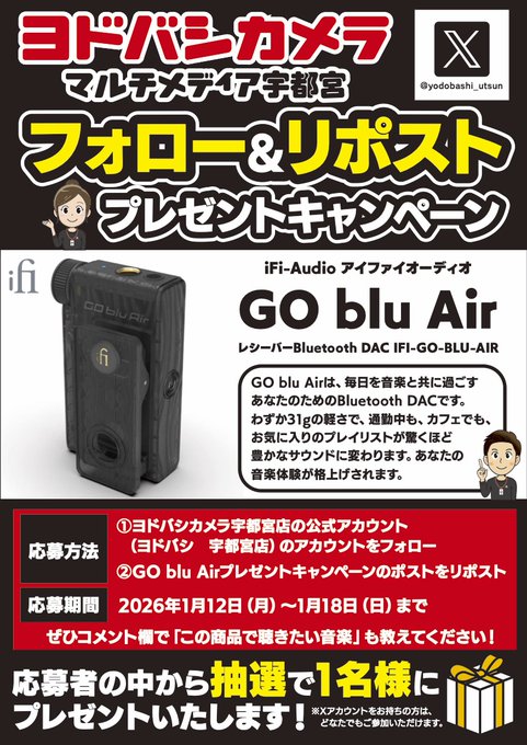 賞品:BluetoothレシーバーiFi-Audio「GO blu Air」(1名様)