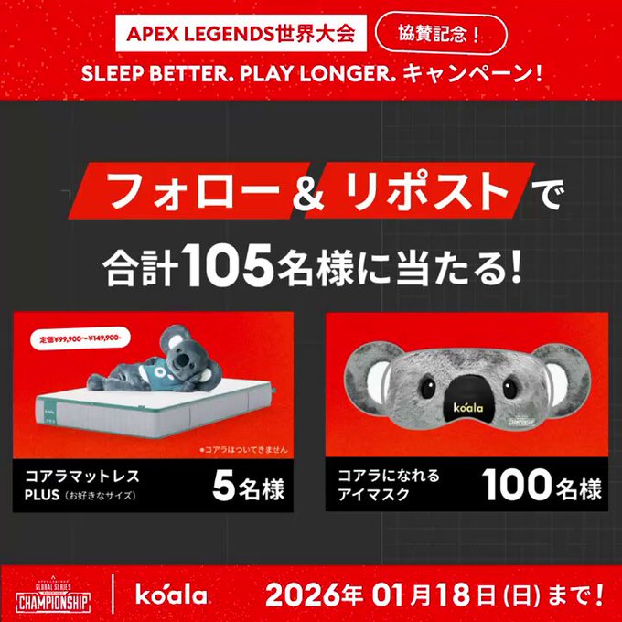 @esports_RAGEと@KoalaMattressJPをフォロー&キャンペーン対象ポストをリポストしてご応募ください。