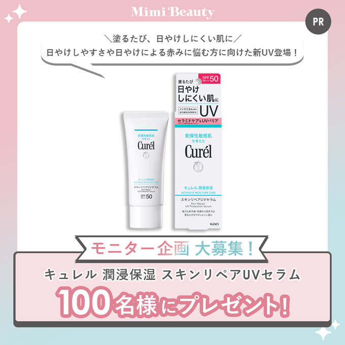 【X懸賞】キュレル 潤浸保湿 スキンリペアUVセラムを100名様にプレゼント 2026.01.15Mimi Beauty‐ガチモニター企画 賞品:キュレル 潤浸保湿 スキンリペアUVセラム(100名様) 締切:2026年1月18日(日)応募条件 ・商品体験頂ける方 ・公開のXアカウントをお持ちの方※詳細はキャンペーンページにてご確認ください。応募はこちらから