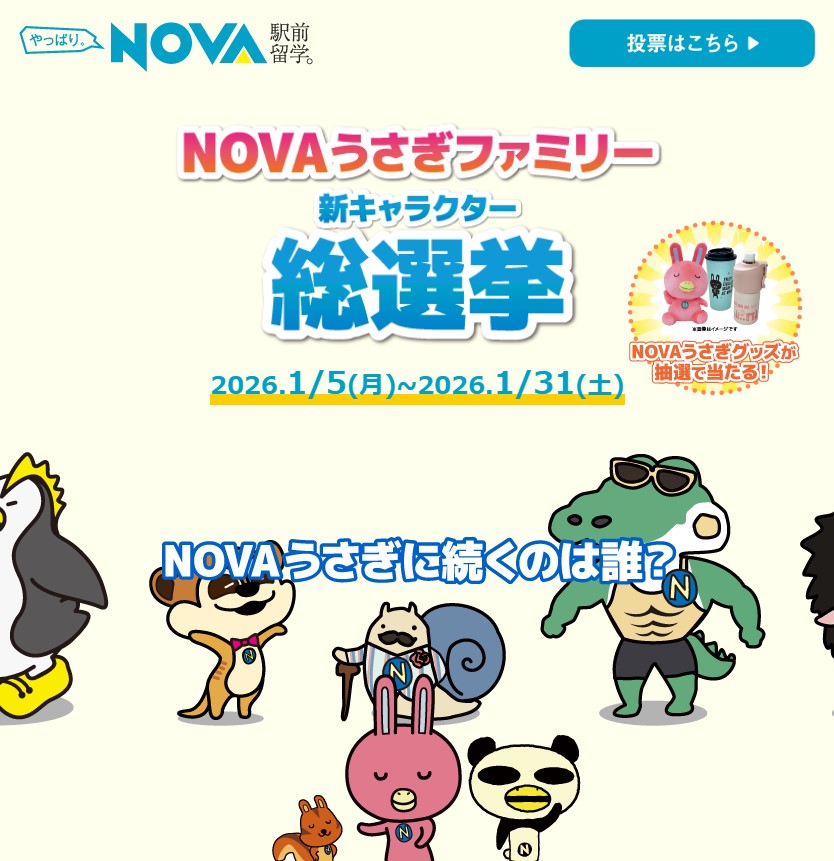 NOVAうさぎオリジナルグッズを10名様にプレゼント 2026.01.15NOVAうさぎファミリー 新キャラクター総選挙 賞品:NOVAうさぎオリジナルグッズ(10名様) 締切:2026年1月31日(土)投票フォームから、NOVAうさぎの仲間にふさわしいキャラクターをお選びください。※詳細はキャンペーンページにてご確認ください。応募はこちらから