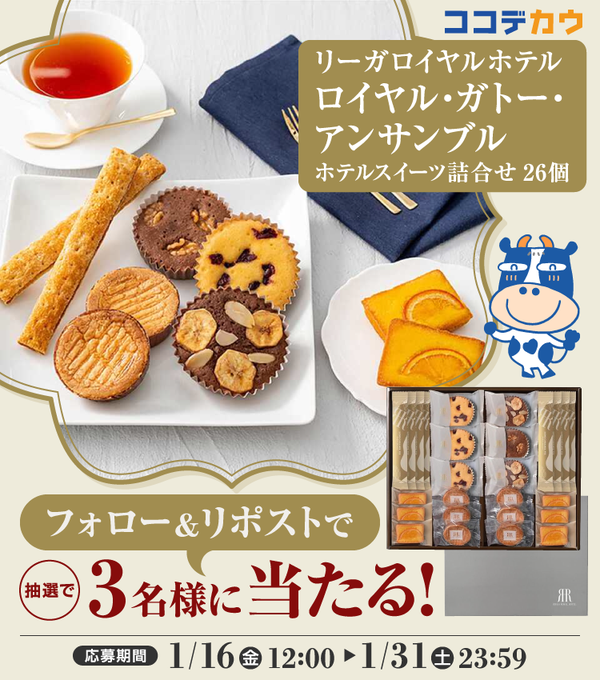 【X懸賞】ホテルスイーツ詰合せを3名様にプレゼント 2026.01.16ココデカウ‐フォロー&リポストキャンペーン 賞品:ホテルスイーツ詰合せ(3名様) 締切:2026年1月31日(土)公式X(Twitter)アカウントをフォロー&キャンペーン対象ポストをリポストしてご応募ください。※詳細はキャンペーンページにてご確認ください。応募はこちらから