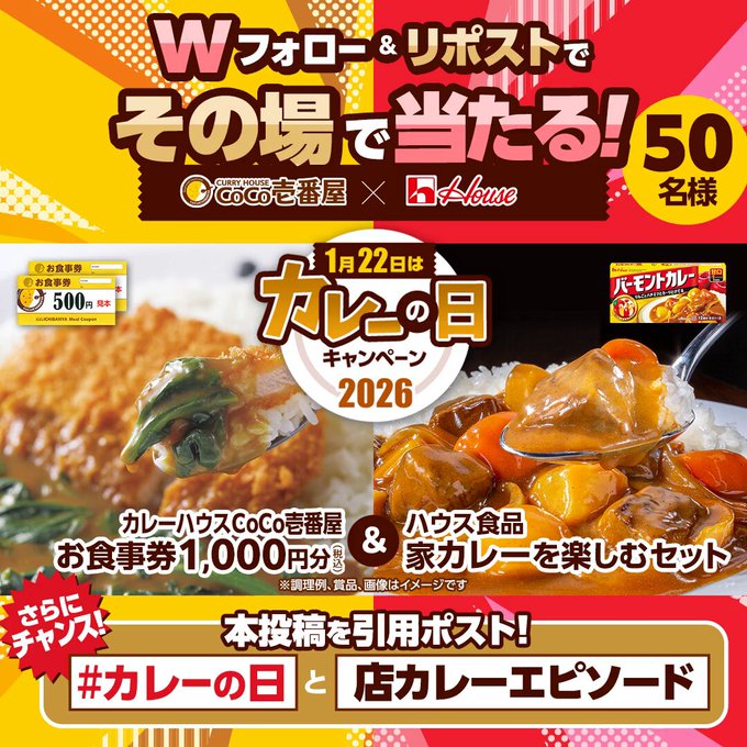 @curryichibanyaと@housefoods_nowをフォロー&キャンペーン対象ポストをリポストしてご応募ください。