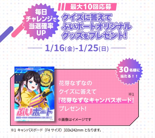【毎日応募】コラボイラスト キャンバスボード(花芽なずなver)を30名様にプレゼント 2026.01.16ぶいボートクイズミッション BBCトーナメント編 賞品:コラボイラスト キャンバスボード(花芽なずなver)(30名様) 締切:2026年1月25日(日)クイズに答えてご応募ください。※詳細はキャンペーンページにてご確認ください。応募はこちらから