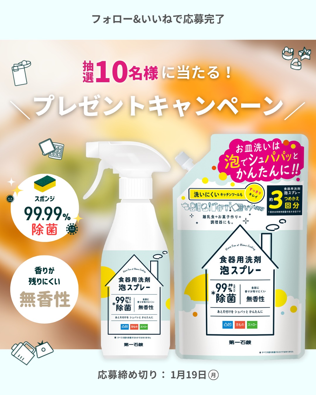 賞品:食器用洗剤泡スプレーの本体と詰替セット(10名様)