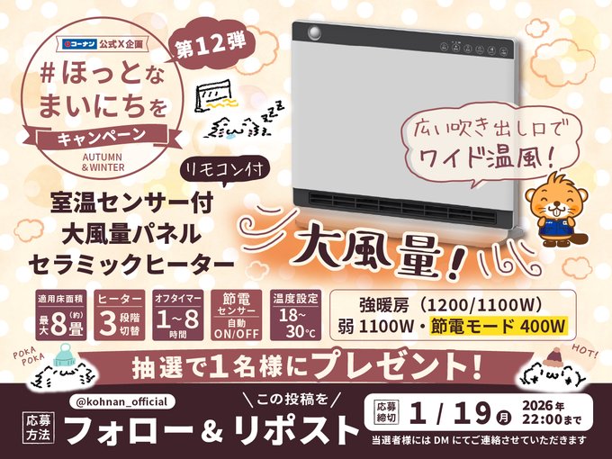 賞品:室温センサー付大風量パネルセラミックヒーター ヒートワイドスリム(1名様)