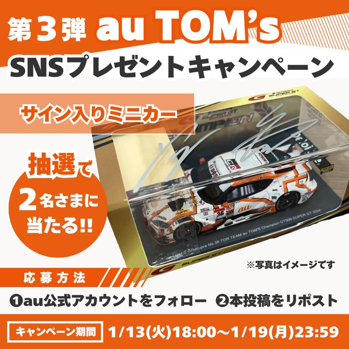 【X懸賞】サイン入りミニカーを2名様にプレゼント 2026.01.17au‐#auTOMS 感謝祭記念 賞品:サイン入りミニカー(2名様) 締切:2026年1月19日(月)公式X(Twitter)アカウントをフォロー&キャンペーン対象ポストをリポストしてご応募ください。※詳細はキャンペーンページにてご確認ください。応募はこちらから