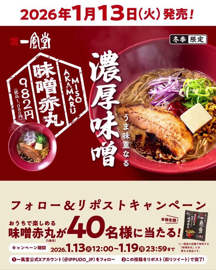 【X懸賞】おみやげラーメンを40名様にプレゼント 2026.01.17一風堂 #味噌赤丸 発売記念キャンペーン 賞品:おみやげラーメン(40名様) 締切:2026年1月19日(月)公式X(Twitter)アカウントをフォロー&キャンペーン対象ポストをリポストしてご応募ください。※詳細はキャンペーンページにてご確認ください。応募はこちらから