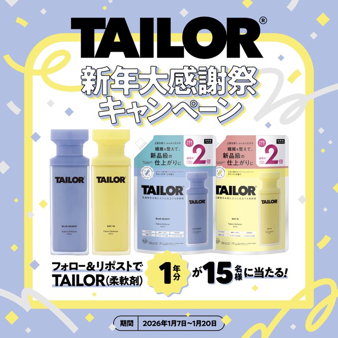 【X懸賞】TAILOR 1年分を15名様にプレゼント 2026.01.18TAILOR 新年大感謝祭キャンペーン 賞品:TAILOR 1年分(15名様) 締切:2026年1月20日(火)公式X(Twitter)アカウントをフォロー&キャンペーン対象ポストをリポストしてご応募ください。※詳細はキャンペーンページにてご確認ください。応募はこちらから