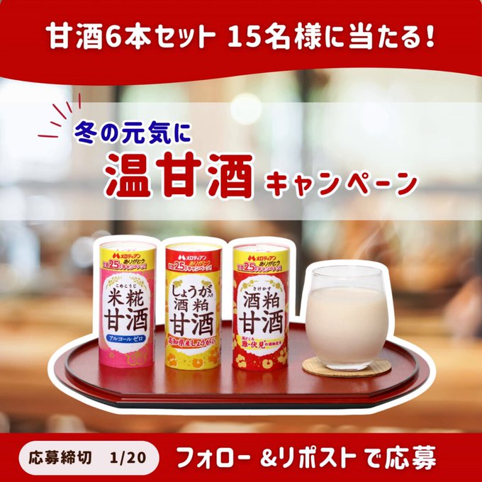【X懸賞】甘酒6本セットを15名様にプレゼント 2026.01.18メロディアン‐冬の元気に温甘酒✨キャンペーン 賞品:甘酒6本セット(15名様) 締切:2026年1月20日(火)公式X(Twitter)アカウントをフォロー&キャンペーン対象ポストをリポストしてご応募ください。※詳細はキャンペーンページにてご確認ください。応募はこちらから