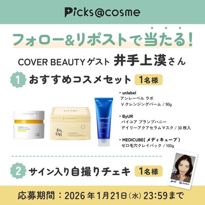 賞品:井手上漠さんサイン入り自撮りチェキ、おすすめコスメセット(2名様)