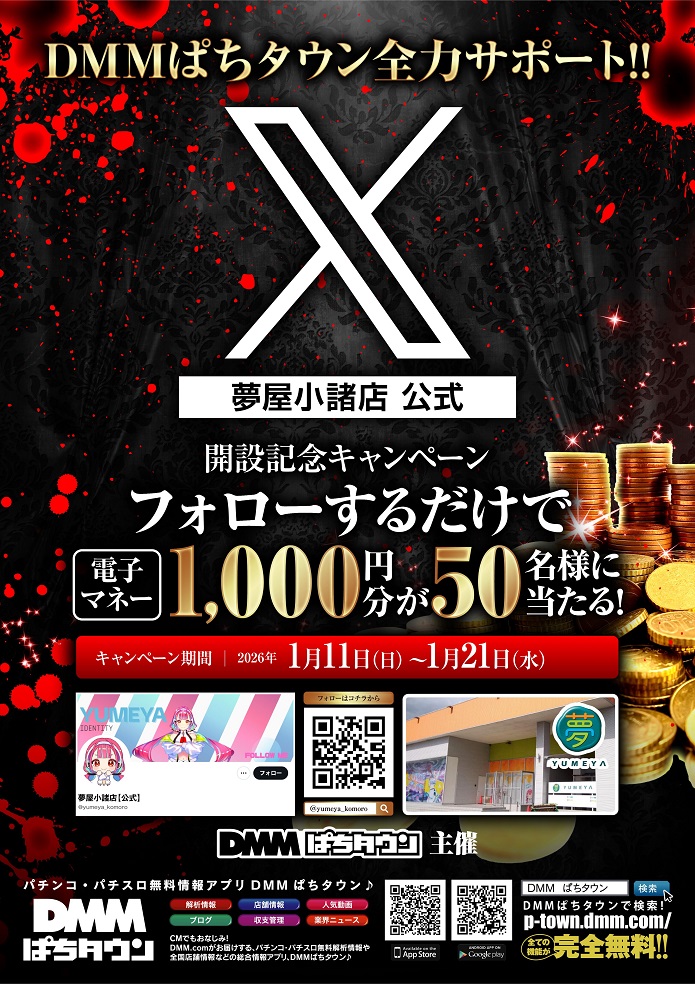 【X懸賞】電子マネー1,000円分を50名様にプレゼント 2026.01.19夢屋小諸店‐夢屋小諸店 公式アカウント開設記念キャンペーン 賞品:電子マネー1,000円分(50名様) 締切:2026年1月21日(水)応募方法: アカウントをフォロー※詳細はキャンペーンページにてご確認ください。応募はこちらから