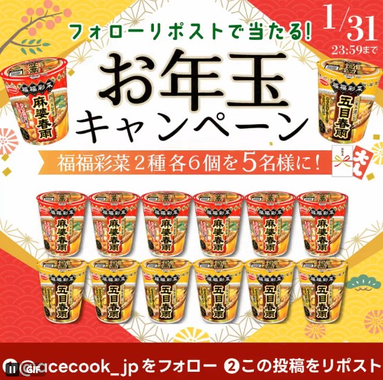 【X懸賞】福福彩菜 2種各6個を5名様にプレゼント 2026.01.19エースコック‐2026年 #お年玉キャンペーン 賞品:福福彩菜 2種各6個(5名様) 締切:2026年1月31日(土)公式X(Twitter)アカウントをフォロー&キャンペーン対象ポストをリポストしてご応募ください。※詳細はキャンペーンページにてご確認ください。応募はこちらから