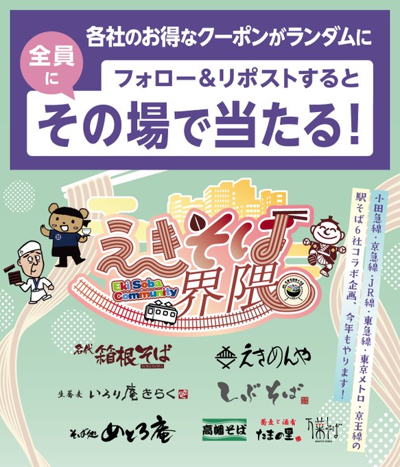 えきそばめぐり 各社のクーポンがランダムで当たる!フォロー&リポストキャンペーン