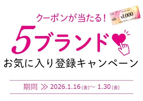 期間中にお気に入りブランドを新たに5つ以上ご登録いただいた方の中から抽選で200名様に1,000円クーポンをプレゼント!