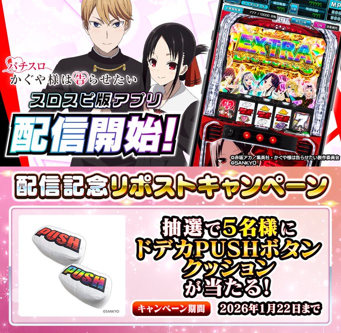 【X懸賞】ドデカPUSHボタンクッションを5名様にプレゼント 2026.01.20スロパチスピリット(スロスピ)‐プレゼントキャンペーン 賞品:ドデカPUSHボタンクッション(5名様) 締切:2026年1月22日(木)①フォロー&RP ②スロスピのタイトル画面を添付RPで当選率UP※詳細はキャンペーンページにてご確認ください。応募はこちらから