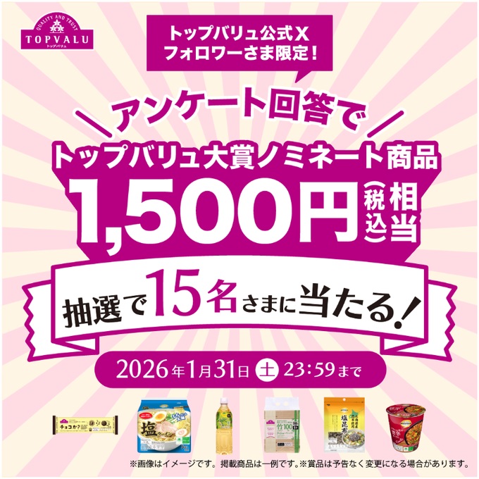 賞品:トップバリュ大賞ノミネート商品1,500円(税込)相当(15名様)