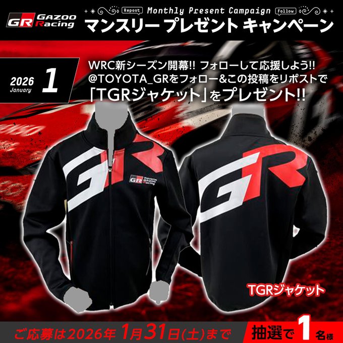 【X懸賞】TGRジャケットを1名様にプレゼント 2026.01.20GAZOO Racing‐フォロー&リポストキャンペーン 賞品:TGRジャケット(1名様) 締切:2026年1月31日(土)公式X(Twitter)アカウントをフォロー&キャンペーン対象ポストをリポストしてご応募ください。※詳細はキャンペーンページにてご確認ください。応募はこちらから