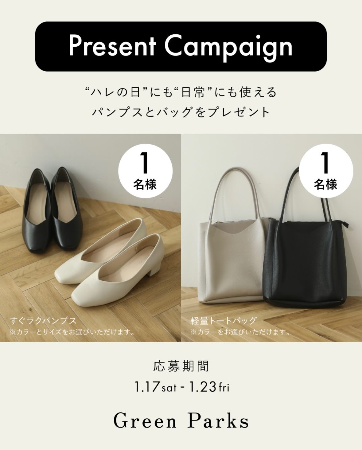 賞品:すぐラクパンプス、軽量トートバッグ(2名様)