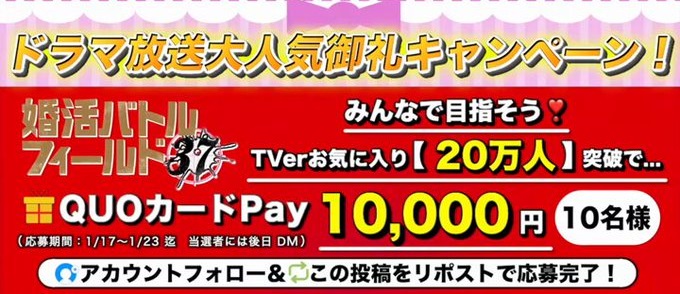 @tx_konkatsu37フォロー&投稿をリポスト&TVerお気に入り登録者数20万人以上達成で、QUOカードPay1万円分を合計10名様にプレゼント