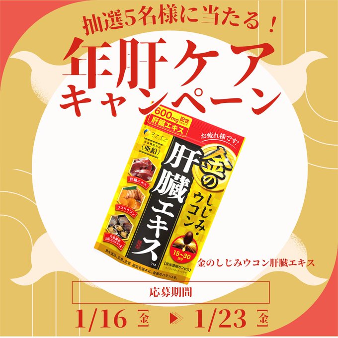 【X懸賞】金の肝臓エキスを5名様にプレゼント 2026.01.21株式会社ファイン‐年肝ケアキャンペーン 賞品:金の肝臓エキス(5名様) 締切:2026年1月23日(金)公式X(Twitter)アカウントをフォロー&キャンペーン対象ポストをリポストしてご応募ください。※詳細はキャンペーンページにてご確認ください。応募はこちらから