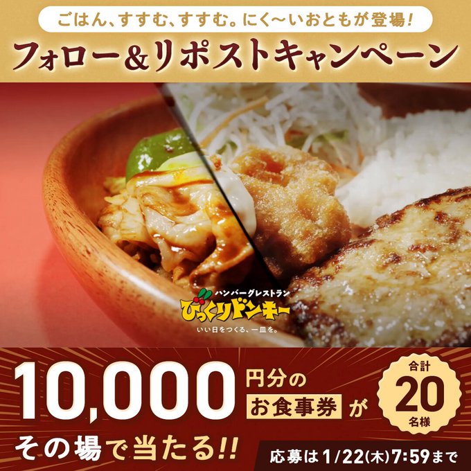 ハンバーグレストラン びっくりドンキー公式X(Twitter)アカウントをフォロー&キャンペーン対象ポストをリポストしてご応募ください。