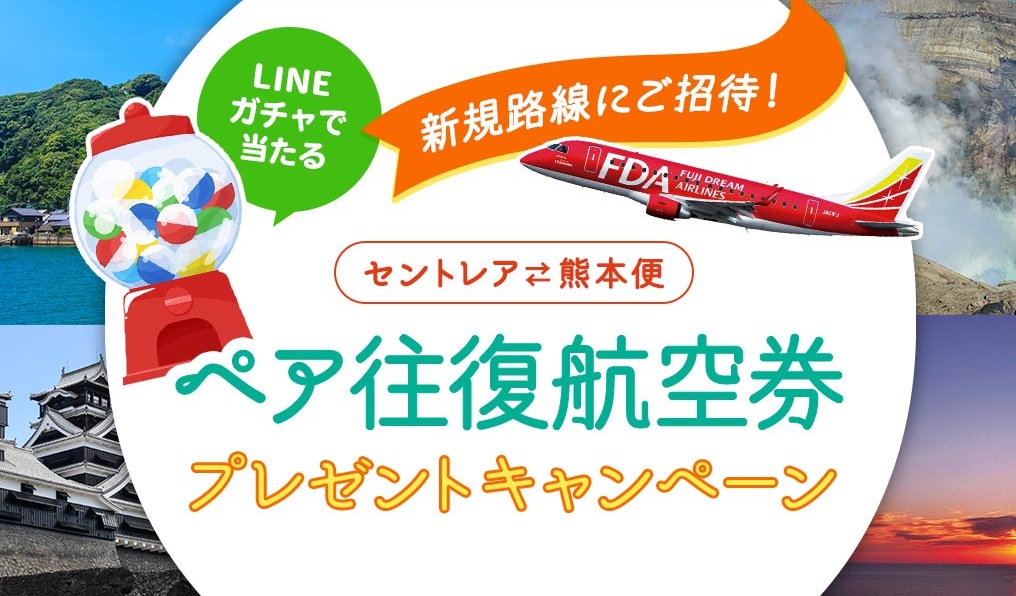 新規路線就航を記念し、中部国際空港(セントレア)=熊本便の航空券をプレゼントするキャンペーンを実施中。LINEお友だち登録の上、ぜひご参加ください。