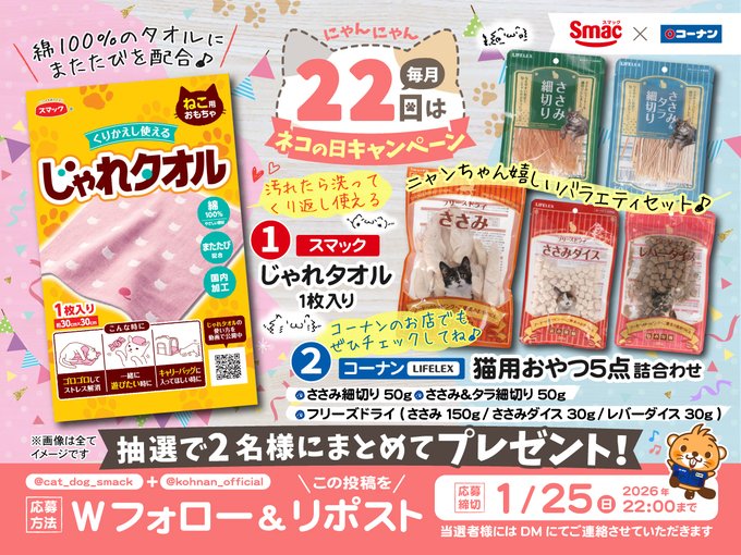 @cat_dog_smackと@kohnan_officialをフォロー&キャンペーン対象ポストをリポストしてご応募ください。
