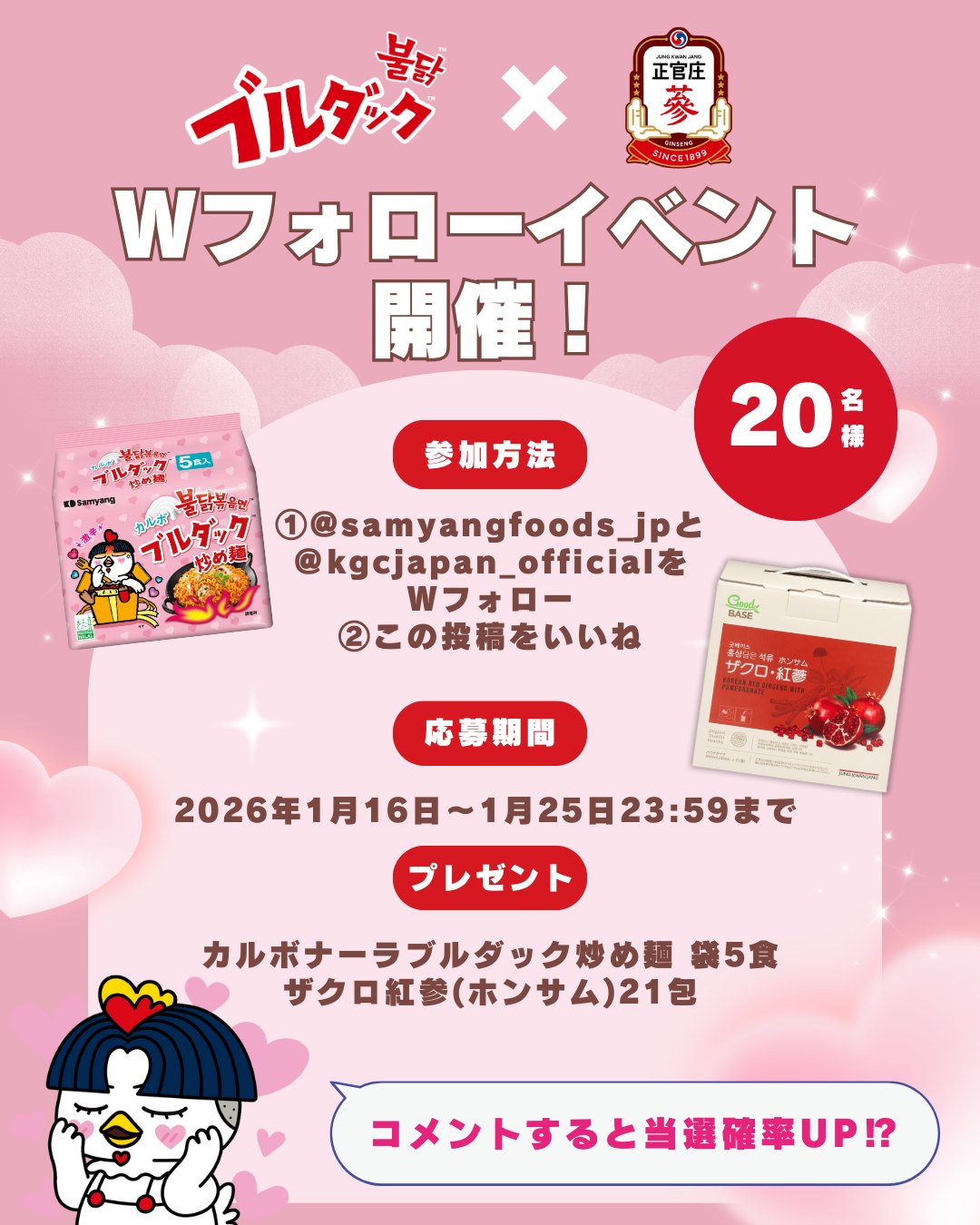 ①@samyangfoods_jp と @kgcjapan_official をWフォロー