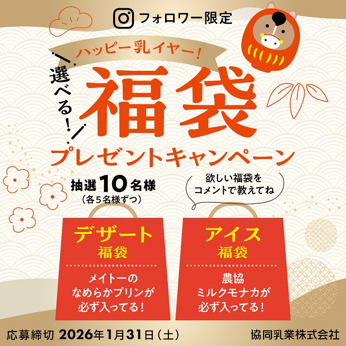 【Instagram懸賞】協同乳業商品詰め合わせを10名様にプレゼント 2026.01.23協同乳業株式会社‐福袋プレゼントキャンペーン 賞品:協同乳業商品詰め合わせ(10名様) 締切:2026年1月31日(土)どちらの福袋が欲しいかコメントで教えてください💭※詳細はキャンペーンページにてご確認ください。応募はこちらから