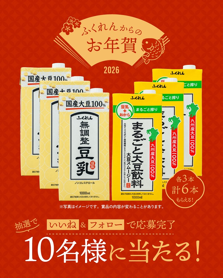 賞品:『ふくれん国産大豆無調整豆乳1000ml』『まるごと大豆飲料 大豆スムージー 1000ml』各3本(10名様)