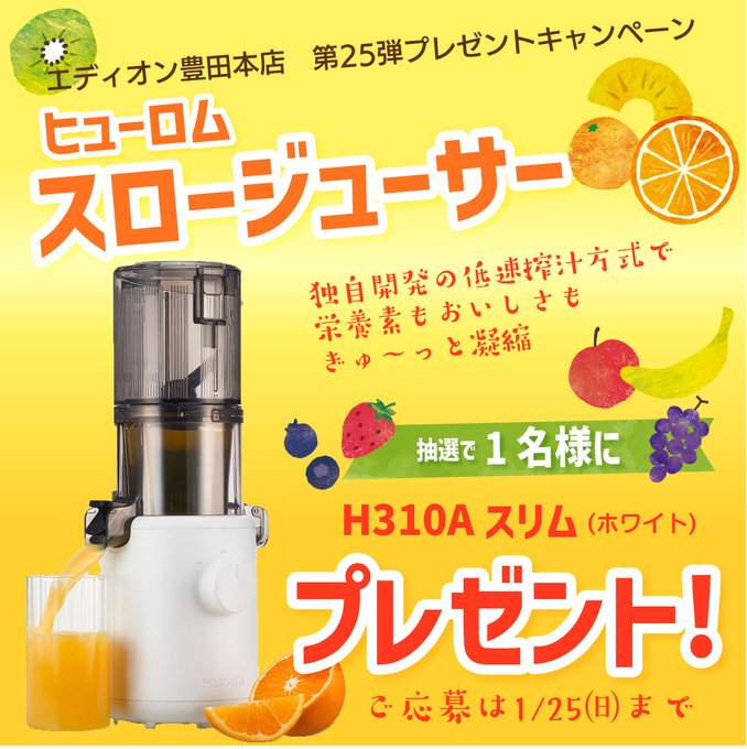 賞品:ヒューロムのスロージューサーH310A(1名様)